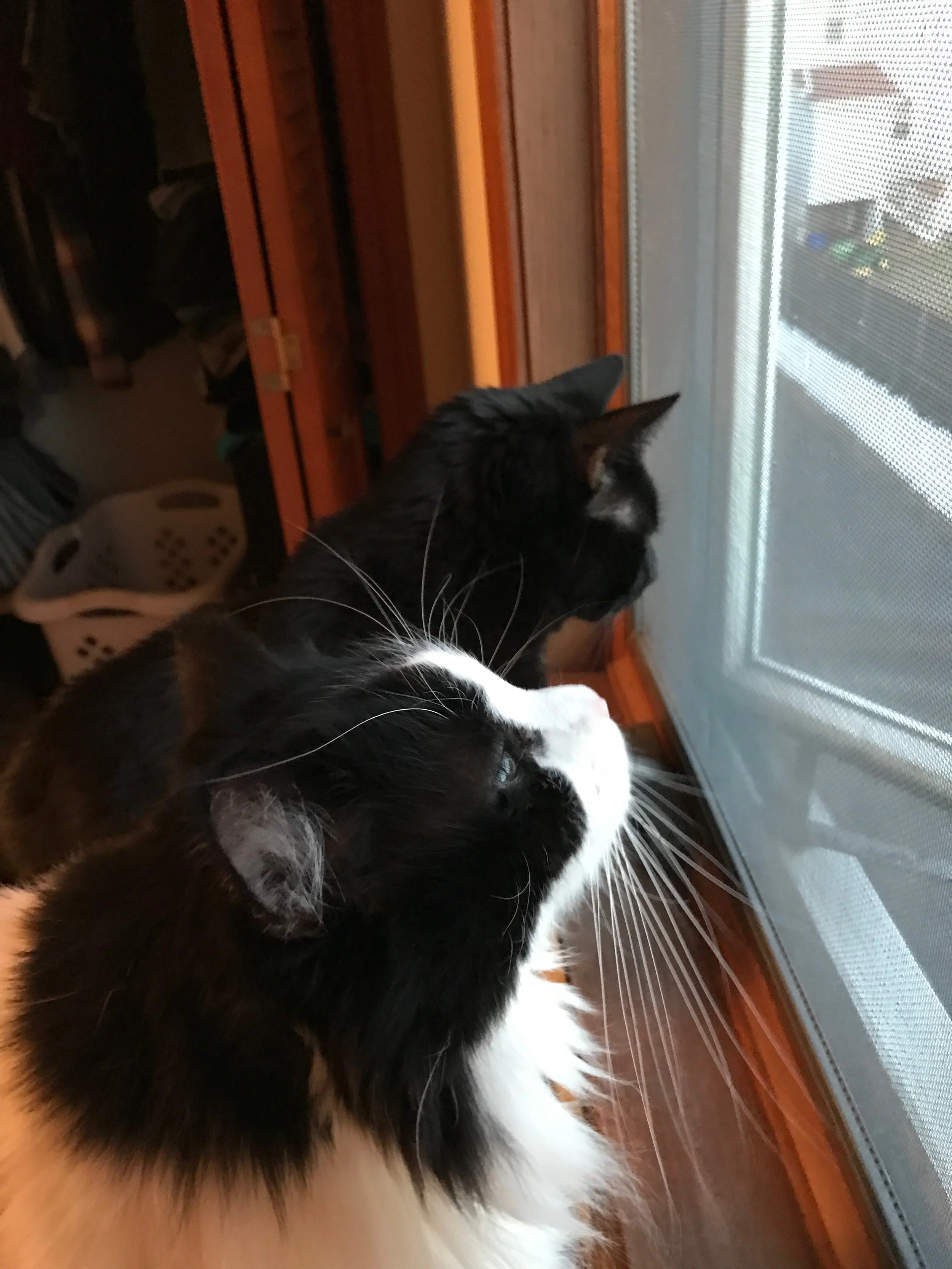 Our black cat, Salem, was a very special guy. He was born with a heart condition that should have taken him in a year, but he stayed with us for 16 years! Salem’s best friend and brother, Squiggy (black & white), is probably the prettiest cat that’s ever lived. So sweet and loving to. Mitzy was every bit the tortie/calico stereotype. She was doing things her way and that was that. :)